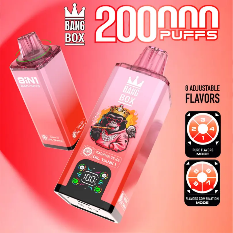 The Bang Box delivers up to 200,000 puffs in one durable device. Enjoy eight flavors across four separate tanks for instant switching. A smart screen tracks battery and juice levels, while the quad mesh coil and 850mAh battery ensure rich flavor and all-day power with fast Type-C charging. Built to last, designed for variety.